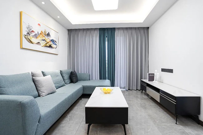藍(lán)灰黑白構(gòu)筑成客廳的色彩空間,在視覺上更偏向沉穩(wěn)冷靜,符合男業(yè)主的性格追求。黑白的巖板茶幾外觀上的樸實(shí)無(wú)華反而更能凸顯作為基礎(chǔ)款茶幾的簡(jiǎn)潔與實(shí)用性,光在收納性能方面就邊流行的圓桌要強(qiáng)上不少。