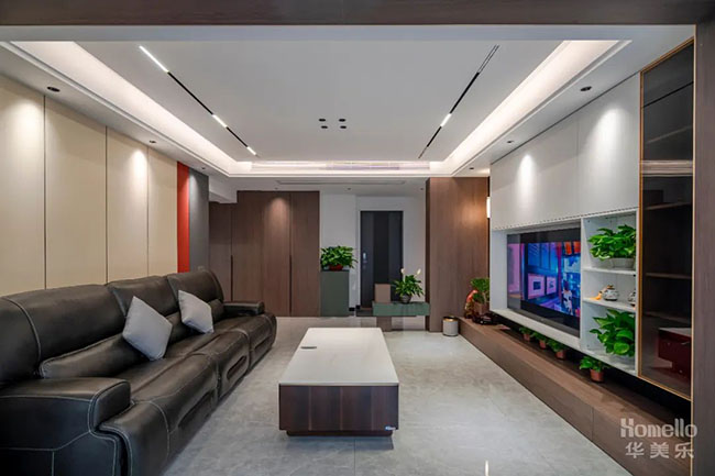 沙發(fā)背景墻貼上了米黃色隔音板,加強(qiáng)吸音效果,增加客廳的色彩溫暖度。黑色真皮沙發(fā)配合巖板的原木桌格外的高級且舒適,沒有了貴妃榻和單人椅,把空間解放出來,簡潔又清爽的感覺瞬間就出來了。