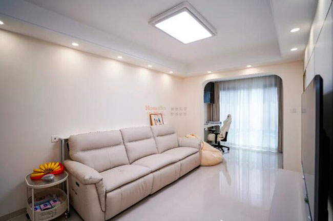 室內(nèi)陽臺打造成工作間,并設(shè)計(jì)門洞作為區(qū)域劃分,保證空間的多功能性的同時(shí)塑造生活儀式感,電視背景墻鋪貼了裝飾板,下方打造電視柜補(bǔ)充客廳收納能力。