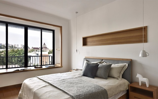 每個(gè)空間,都保有落地大窗或門;連主過道都保證南北通夠,不管望向哪一邊,皆能看觀賞到設(shè)計(jì)師在的庭院或陽臺精心布置的景觀。連與鄰居相鄰面榻榻米的窗戶,用了木塑方通裝飾,點(diǎn)綴綠植,既提高私密性,也讓坐在榻榻米的人可以欣賞到景觀。