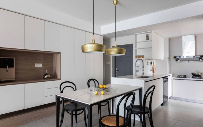 打通廚房與餐廳的隔斷,L型的廚房島臺(tái)從入戶處開始延伸。廚房沒有了遮擋物,視線自然通透。開放式的餐廚區(qū),一切以小舒顏的成長和安全出發(fā),無論孩子在何處,父母的視線都能緊隨其后。