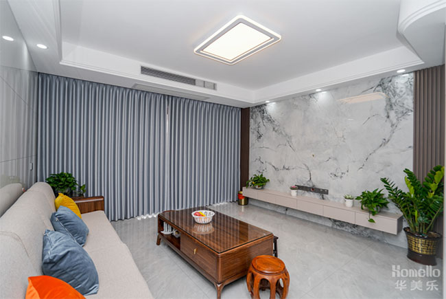 天花做了簡(jiǎn)單邊頂,安裝了40*80的平面吸頂燈作為主燈,造價(jià)比傳統(tǒng)大吊燈便宜不少,而且滿足客廳的照明需求。配套的家居嘗試了中西合一,現(xiàn)代沙發(fā)保證了就坐的舒適度,中式的茶幾和單人椅放在這里會(huì)顯得額外的吸睛,重點(diǎn)是中式茶幾的耐用度更高,收納空間也合理。放眼這個(gè)客廳,既有現(xiàn)代的時(shí)尚感,同時(shí)也帶有一些中式傳統(tǒng)的韻味。