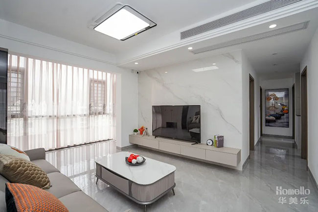 沙發(fā)+巖板茶幾幾乎是時(shí)下的標(biāo)配組合,茶幾選擇了長(zhǎng)方體款,擁有更實(shí)在的收納空間,沙發(fā)背景墻安裝拼合式掛畫(huà),增添客廳藝術(shù)氛圍,提升格調(diào)。沙發(fā)背景由巖板大板磚砌成,與地板紋路相呼應(yīng),拉升質(zhì)感與格局。下方打造了架空式的電視柜,柜面可以放置電視和裝飾,底部可以放置綠植增添生機(jī),同時(shí)對(duì)于日常清潔工作來(lái)說(shuō)會(huì)更加的友好。
