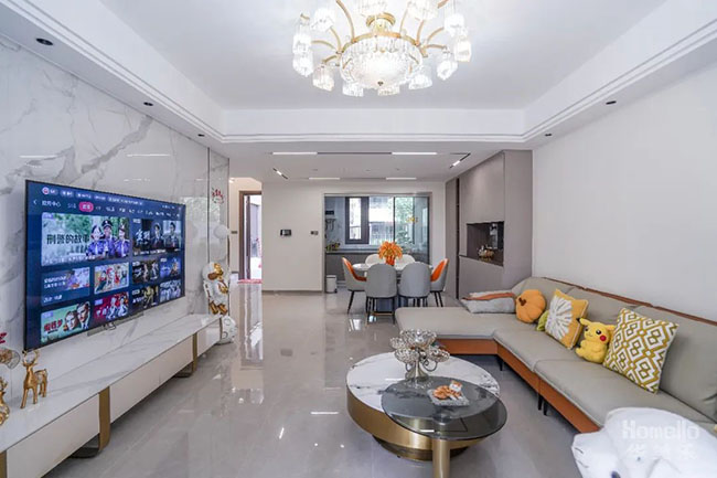 客廳選擇的通刷大白墻和通鋪大理石地板來提高室內(nèi)明亮度, 天花做了雙眼皮,更好地展示空間感,搭配水晶吊燈,簡約的同時帶出高級感。