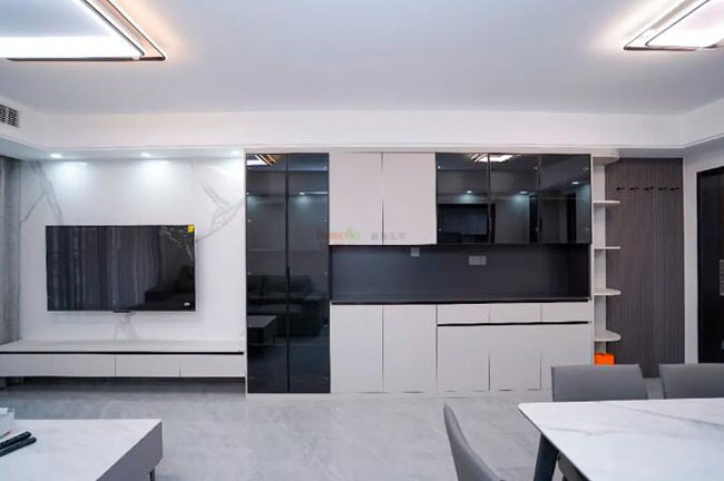 客廳整體設(shè)計(jì)以黑白灰的經(jīng)典簡(jiǎn)約色為主,地板通鋪云紋大理石,天花安裝簡(jiǎn)約圖形吸頂燈。沙發(fā)背景墻采用純白墻漆,配以巖板茶幾后,整體外觀時(shí)尚前衛(wèi)的基礎(chǔ)下帶出高級(jí)感。