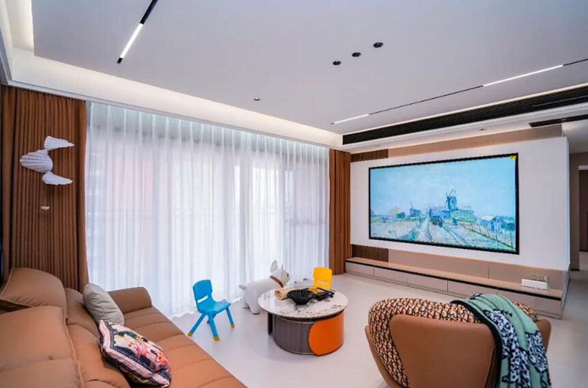 設(shè)計師巧妙用圓形打破方正格局:雙層錯落的胡桃木圓茶幾,搭配邊緣內(nèi)嵌的橙色亞克力燈帶,夜晚亮起時宛如懸浮的月球燈。懸浮式電視墻與超大激光屏形成視覺C位,溫柔的紗簾晴天濾出斑駁樹影,雨天則化作朦朧濾鏡,讓空間始終流動著自然光影。兼顧影院模式、聚會模式和躺平模式的客廳,正在用溫柔的細節(jié)告訴你:所謂理想生活,不過是讓每個物件都長在恰好的位置。