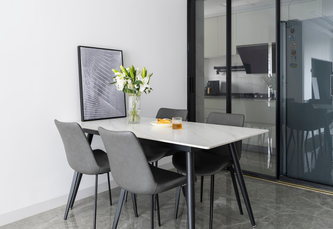 廚房與餐廳用三聯(lián)動推拉門,相比兩扇的推拉門,三扇的視野更顯開闊 ,灰玻的使用比清波更加有質感。