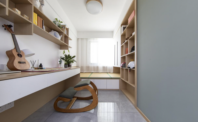 書房右手邊墻刷的是與次臥室一樣的頁巖綠,既保持了整個房間風格統(tǒng)一,也給書房增添了活潑的氣息。