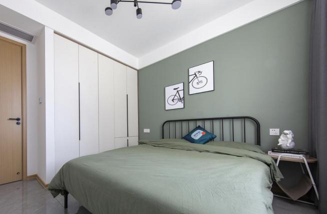 頁巖綠色的背景墻,白色的衣柜,黑色的鐵架床,一個小茶幾用來充當床頭柜,再加上墻上簡單干凈的兩幅畫,滿滿的高級感