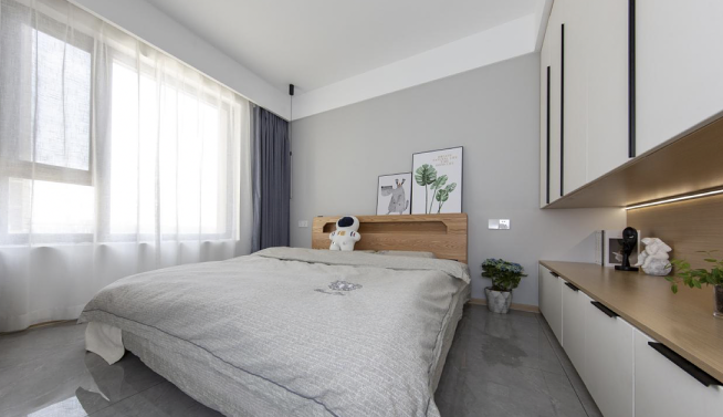 整體色調(diào)延續(xù)了客廳的風格,背景墻為灰色調(diào),更加襯托了空間的高級感,既簡約而又不與眾不同,再搭配著原木色彰顯著高雅溫馨的氛圍,相信在這樣的環(huán)境下入眠,一定會有一個好夢吧!