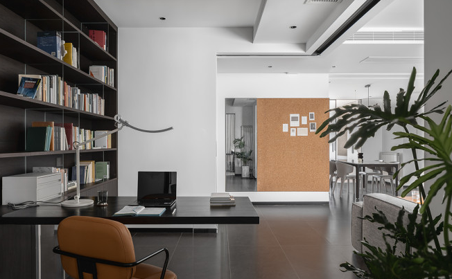 書(shū)房墻面材質(zhì)和地面材質(zhì)和客餐廳相統(tǒng)一,書(shū)桌選用一張整板搭配亞克力桌腿和書(shū)柜形成統(tǒng)一,以一種自然輕盈的藝術(shù)形態(tài)在空間里靜立。
